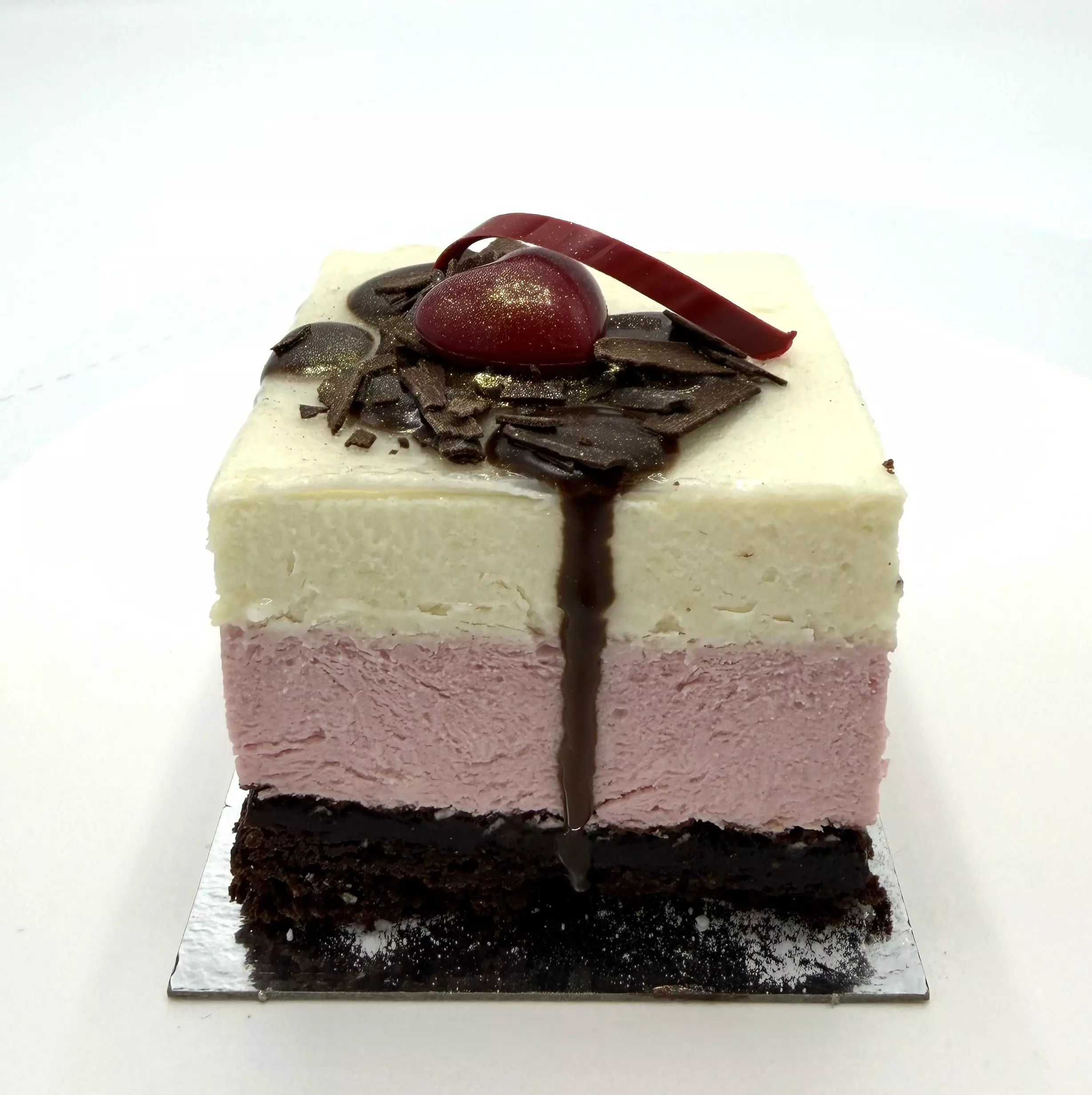 Suklaaganache (laktoositon KERMA, E407, tumma suklaa (sokeri, palmuöljy, kaakaojauhe, E322 auringonkukkalesitiini, E492, aromi)), suklaakoristeet (sokeri, kaakaovoi ja -massa, täysMAITOjauhe,