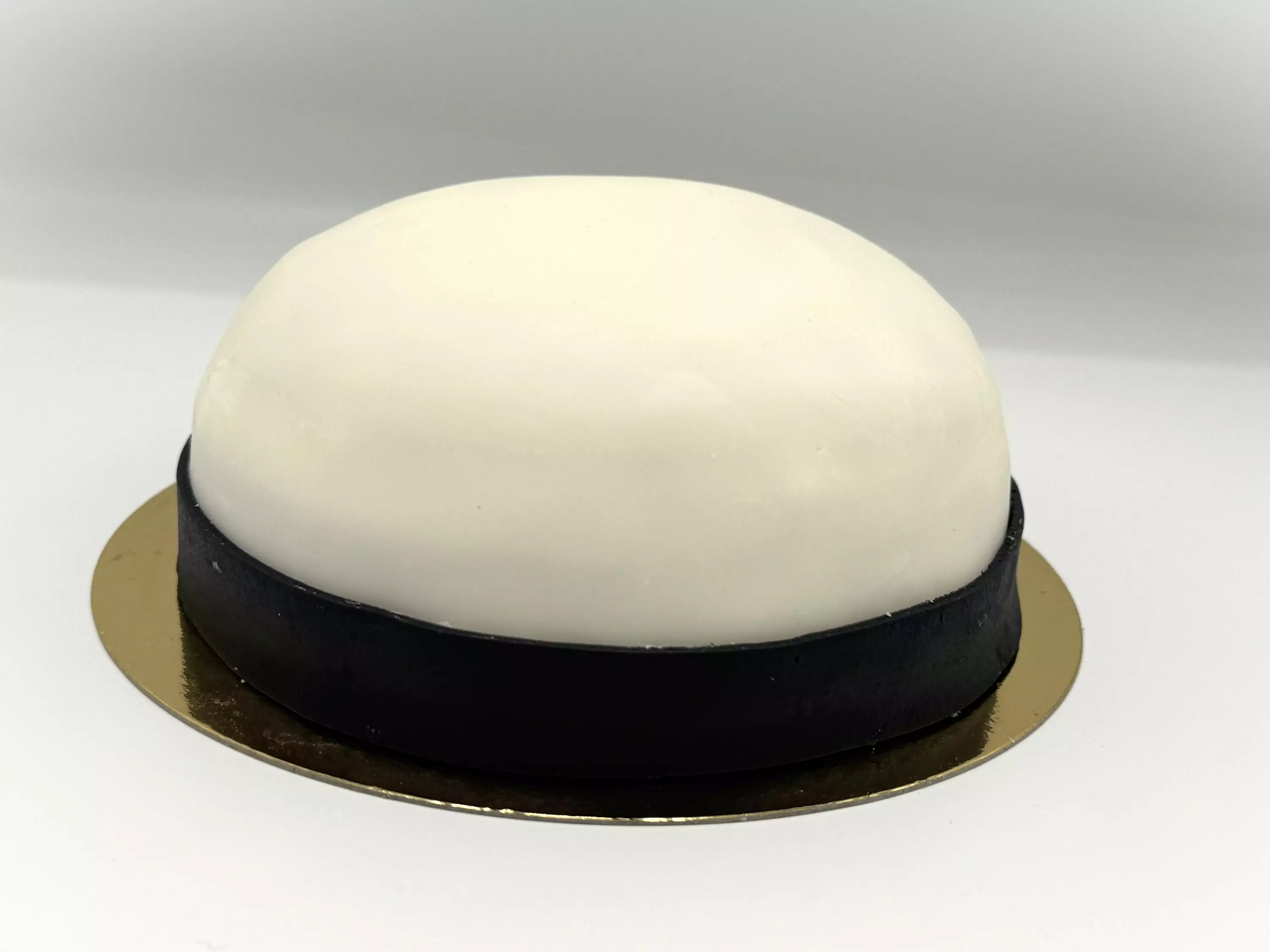 Valkoinen päällinen on sokerimassaa, musta osa on marsipaania