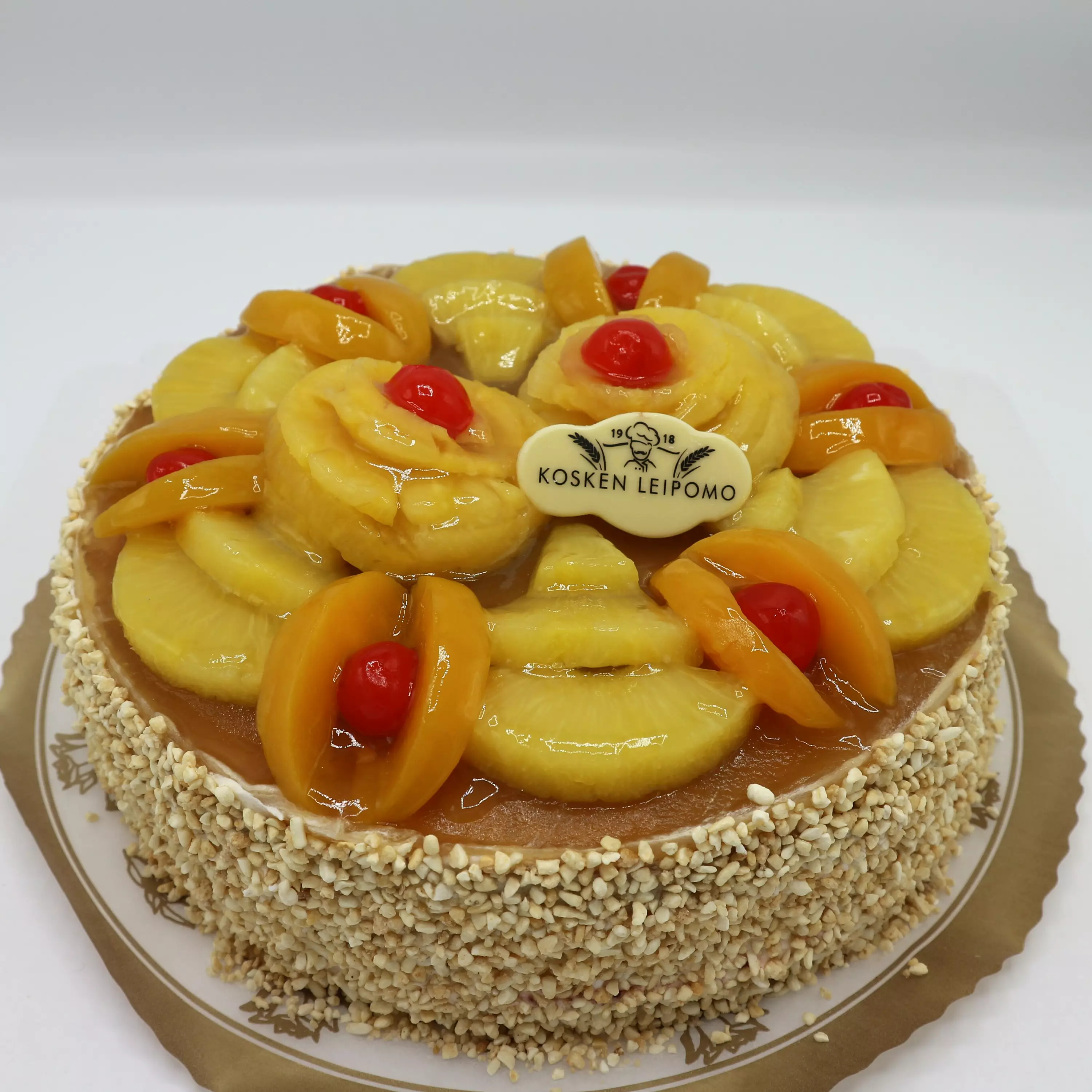 Hedelmäkakku on klassinen täytekakku, jonka välissä on vadelma- ja omenahilloa sekä kasvipohjaista kreemiä. Kakku on koristeltu persikalla, ananaksella ja kirsikoilla - reunoilla on rapeaa krokanttia karamellisoidusta riisistä ja sokerista. Hedelmäkakku on kermattomuutensa vuoksi hyvä vaihtoehto, jos etsii täytekakkua, joka säilyy kauemmin lämpimässä tarjoiluympäristössä.