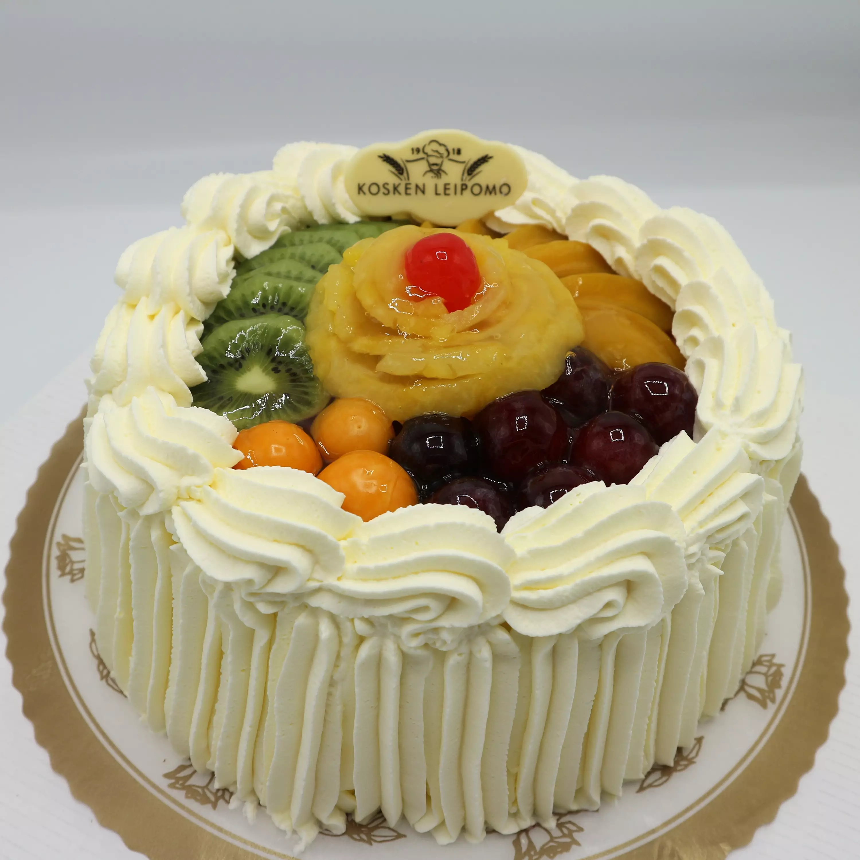 Kakku on kuorrutettu kermavaahdolla ja koristeltu näyttävästi erilaisilla hedelmillä.