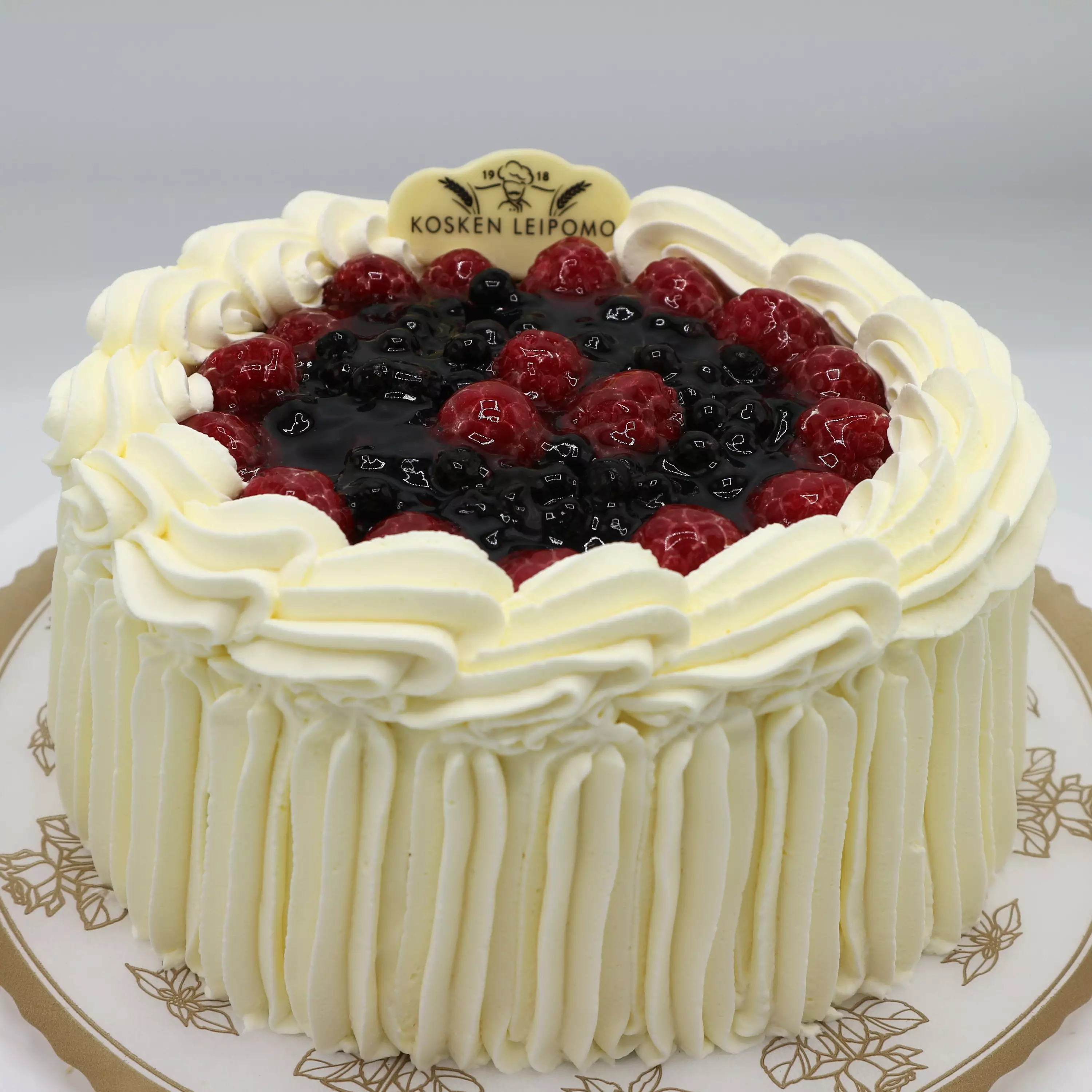 Kakku on kuorrutettu kermavaahdolla ja koristeltu vadelmilla ja mustikoilla.