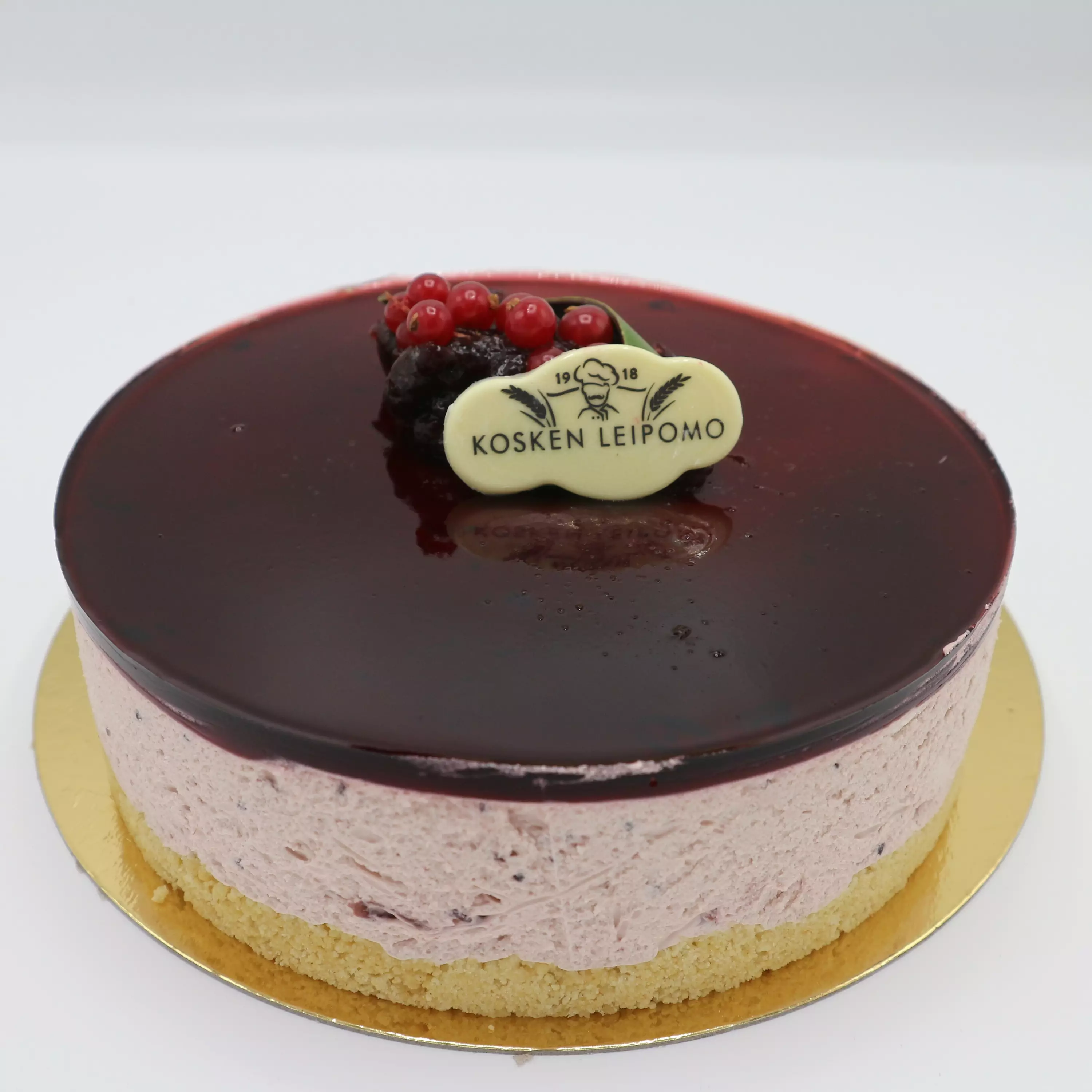 Kakku on päällystetty mustaherukkakiilteellä ja koristeltu suklaalaatalla, suklaakiehkuroilla sekä punaherukoilla.