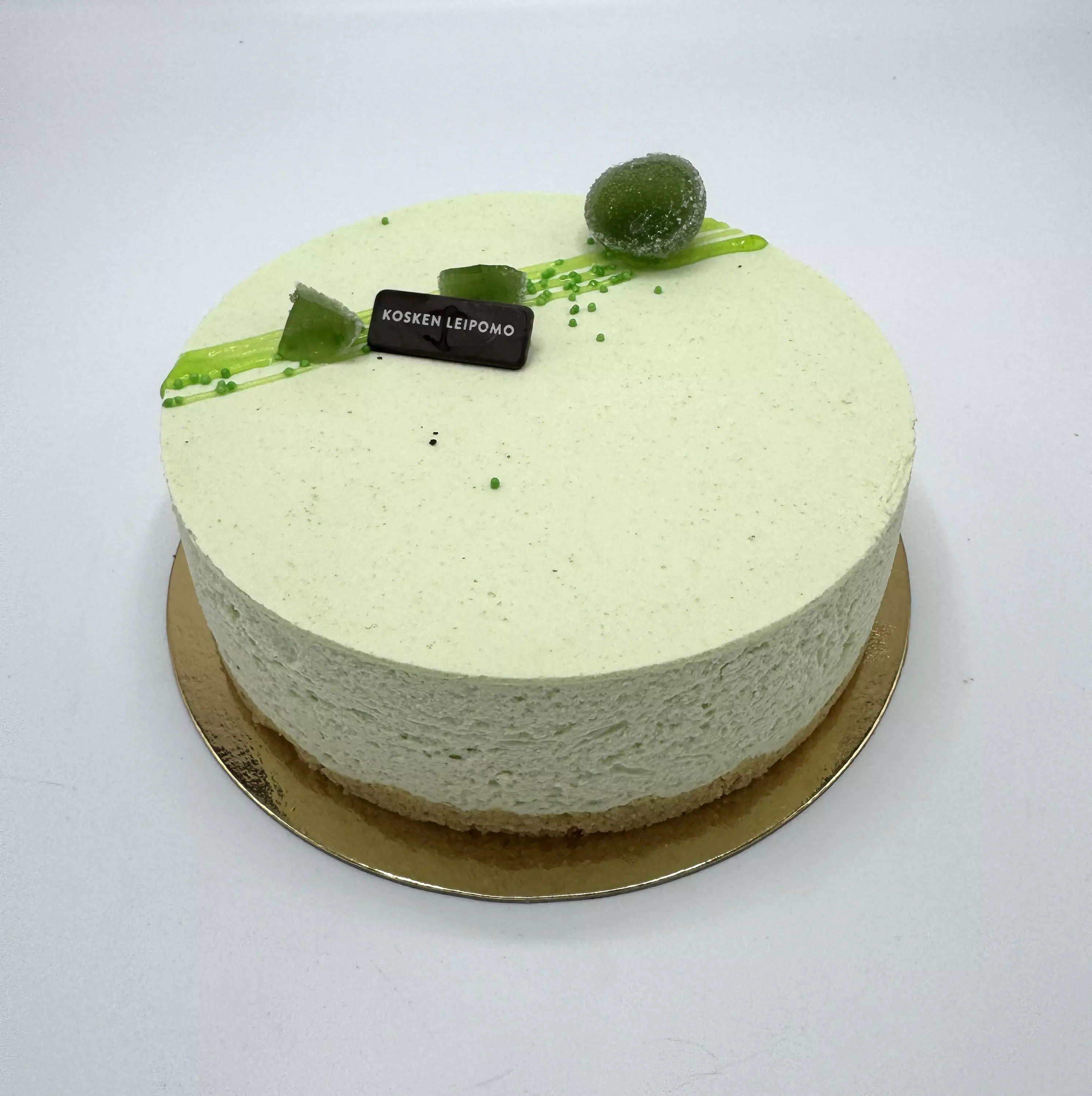 kermavaahdosta ja päärynähillosta. Kakku on koristeltu kauniin yksinkertaisesti Vihreät