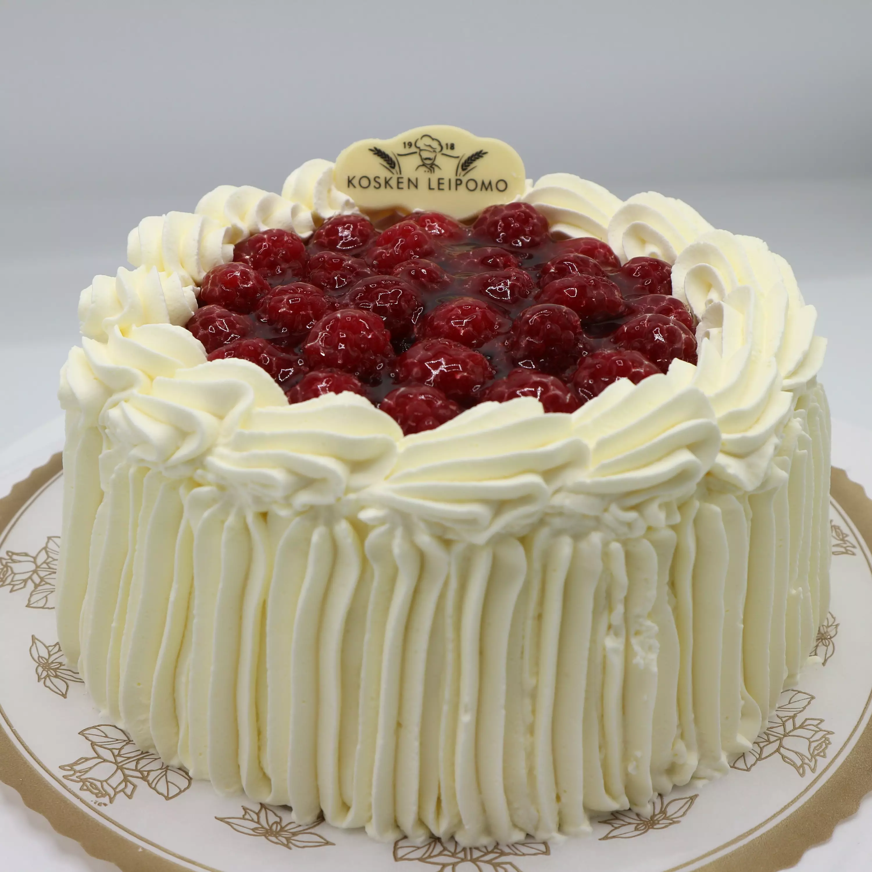 kerma ja raikkaat, tuoreet vadelmat. Kakku on kuorrutettu kermavaahdolla ja koristeltu