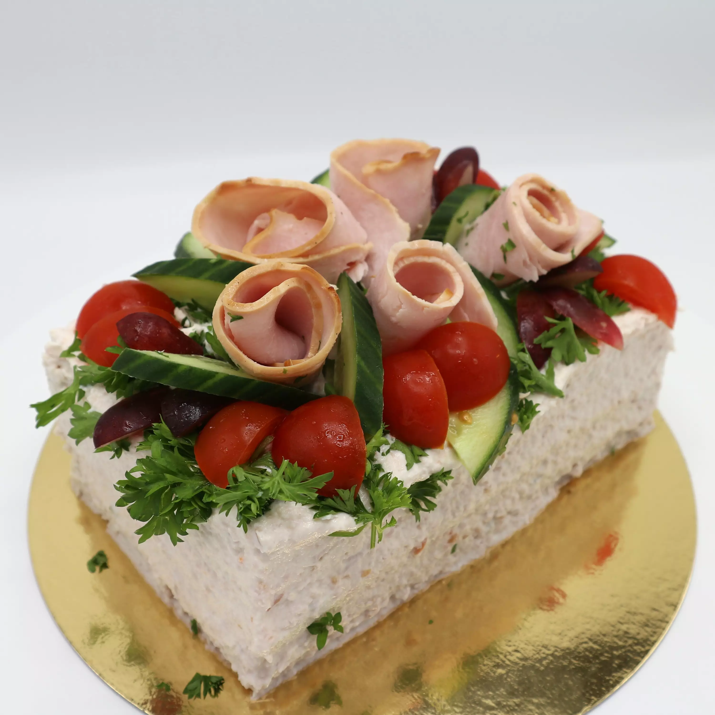 Kalkkunavoileipäkakun pohjana on Frian gluteenitoon leipä, joka kostutetaan kasvisliemellä.