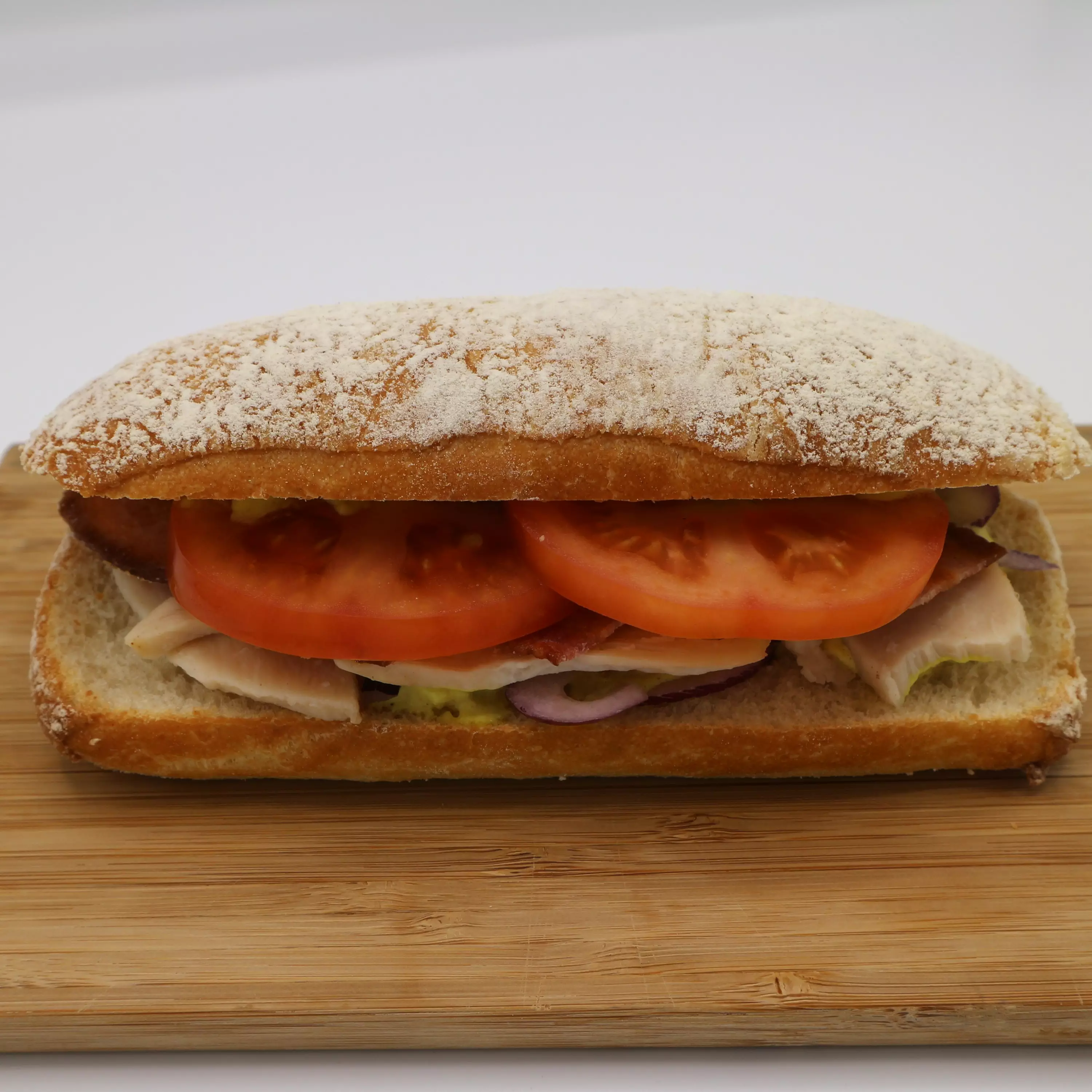 Broilerin rintafile, tomaatti, punasipuli, pekoni (sianliha, suola, E326, mausteuutteet, säilöntäaineet (E250, E262), E301))