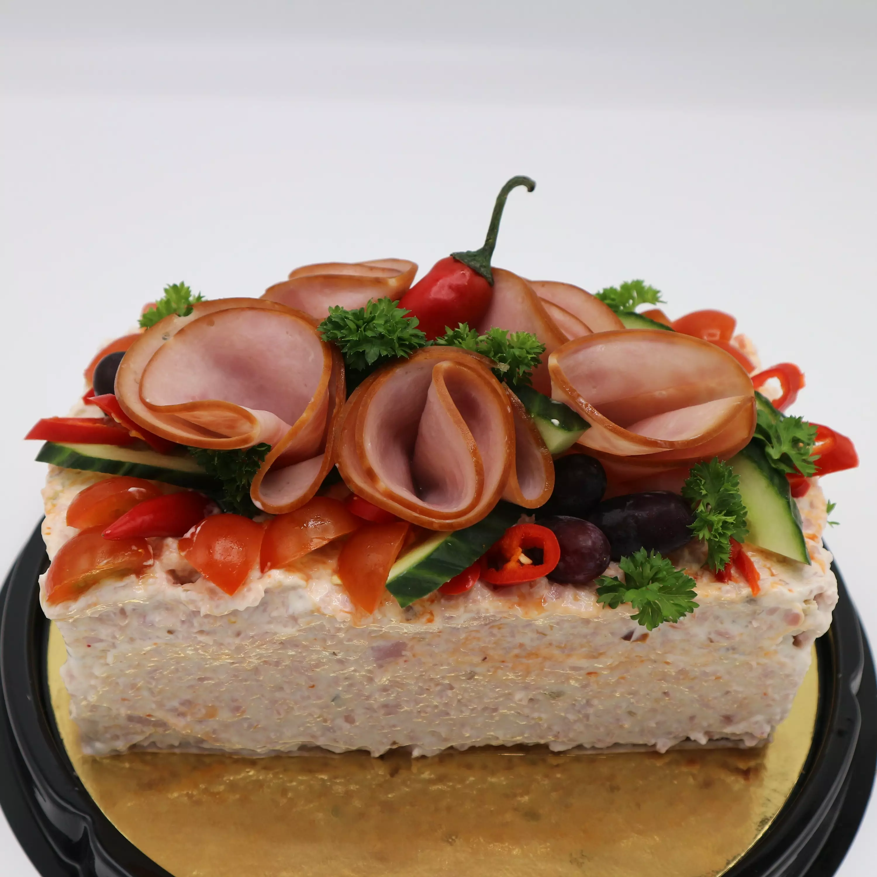 Kinkku-chilivoileipäkakun pohjana on Frian gluteenitoon leipä, joka kostutetaan kasvisliemellä.