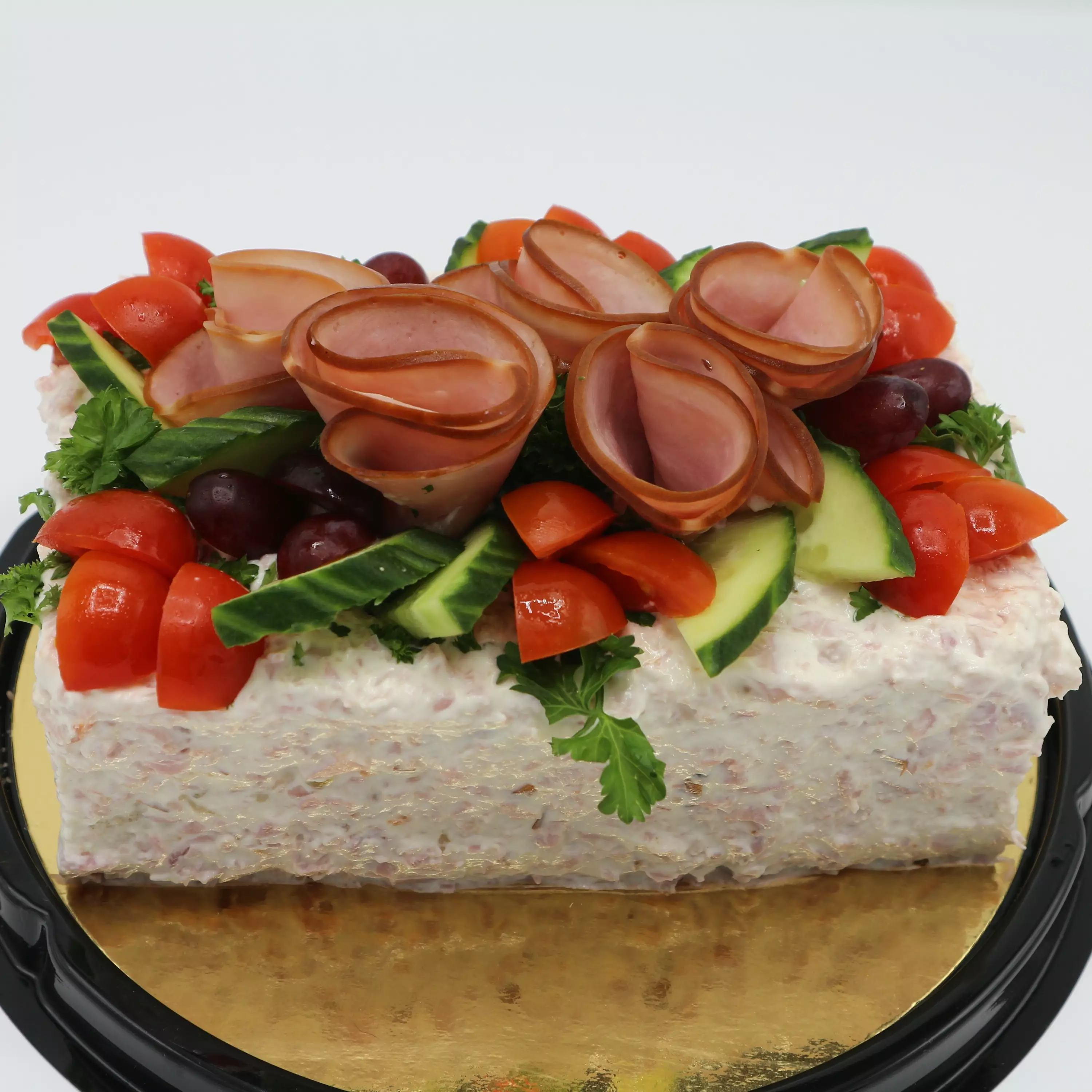 Palvad skinka (fläsk, vatten, salt, E407, E425, E450, E451, potatisstärkelse, köttprotein, dextros, aromer, jästextrakt, kryddextrakt: muskotnöt, svartpeppar), tomat, vindruva, persilja, gurka