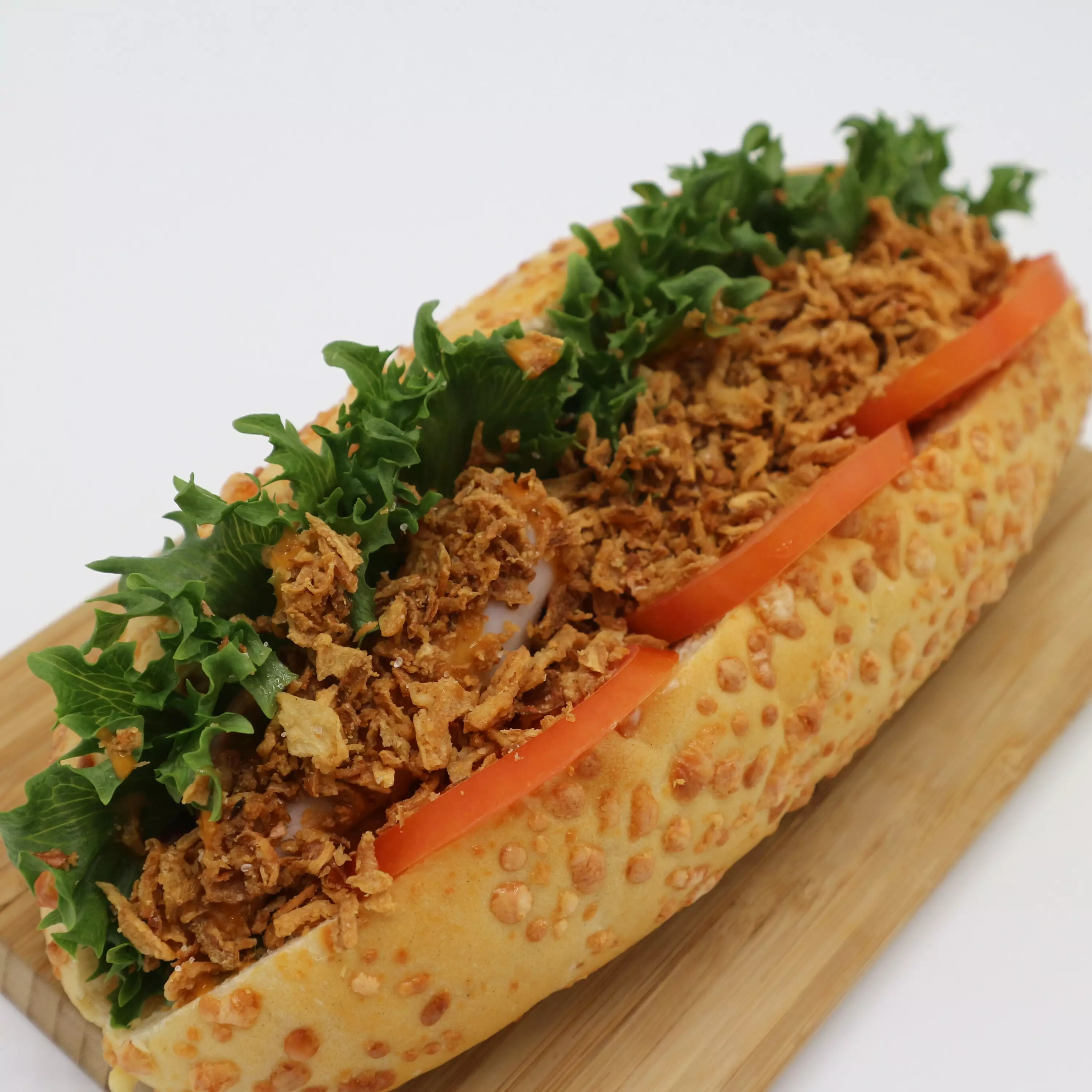 Issallad, tomat, rödlök, kryddgurka (gurka, vatten, socker, salt, vinäger, natriumbensoat, aromer, kalciumklorid, sackarin), rostad lök (lök, palmolja, VETEmjöl, salt), kryddad