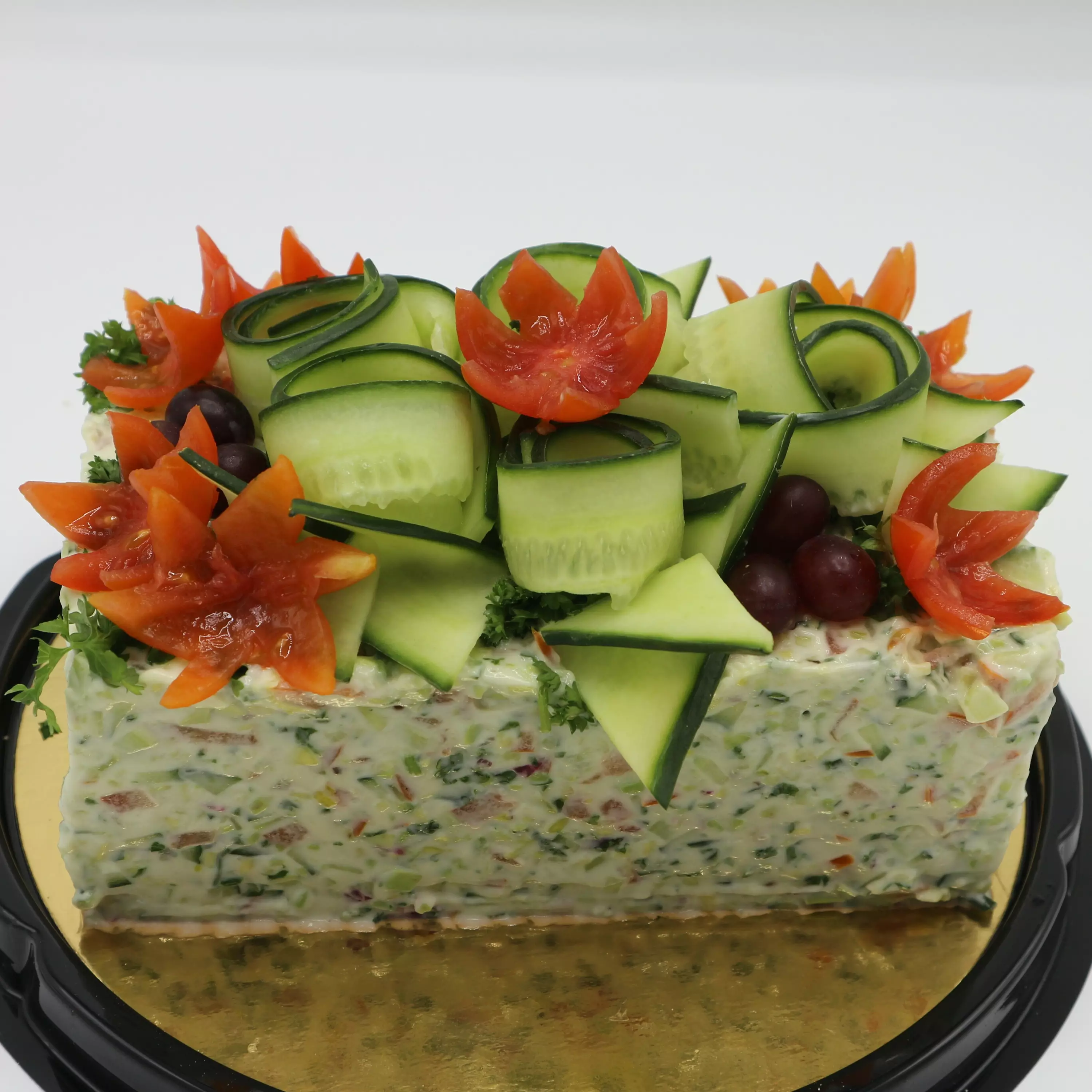 majoneesi tuovat makuun täyteläisyyttä. Kakku on koristeltu kauniilla tomaattikukilla, kurkulla,
